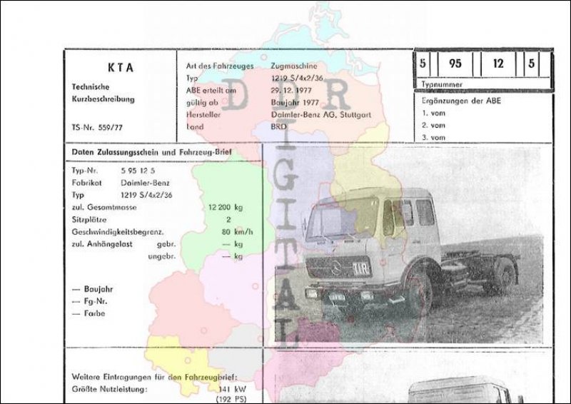 Art des Fahrzeuges: Zugmaschine Typ: 1219 S/4x2/36 ABE erteilt am: 29.12.1977 gültig ab: 1977 Hersteller: Daimler Benz AG Stuttgart Land: BRD Ergänzung zur ABE: Typnummer: 595125 Anzahl Seiten: 2