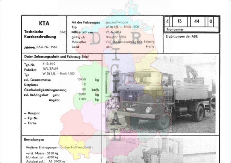 Art des Fahrzeuges: Lastkraftwagen Typ: W 50 L/L-Heck 1000 ABE erteilt am: 25.06.1984 gültig ab: 1984 Hersteller: VEB IFA-Automobilwerke Ludwigsfelde Land: DDR Ergänzung zur ABE: Typnummer: 413440 Anzahl Seiten: 2