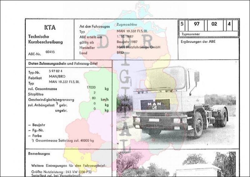Art des Fahrzeuges: Zugmaschine Typ: MAN 19.332 FLS/BL ABE erteilt am: 01.10.1987 gültig ab: 1987 Hersteller: MAN Nutzfahrzeuge GmbH Land: BRD Ergänzung zur ABE: Typnummer: 597024 Anzahl Seiten: 2