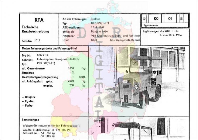 Art des Fahrzeuges: Traktor Typ: DFZ 322/1-FH ABE erteilt am: 17.04.1969 gültig ab: 1986 Hersteller: VEB Oberlausitzer Stahl- und Fahrzeugbau Georgewitz-Bellwitz Land: DDR Ergänzung zur ABE: 7. vom 18.02.1986 Typnummer: 500018 Anzahl Seiten: 3