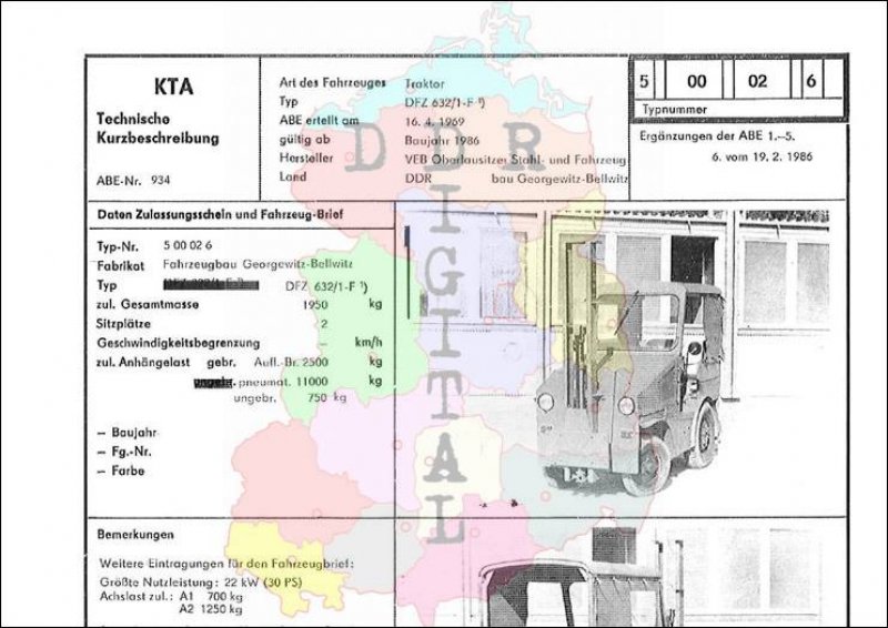 Art des Fahrzeuges: Traktor Typ: DFZ 632/1-F ABE erteilt am: 16.04.1969 gültig ab: 1986 Hersteller: VEB Oberlausitzer Stahl- und Fahrzeugbau Georgewitz-Bellwitz Land: DDR Ergänzung zur ABE: 6. vom 19.02.1986 Typnummer: 500026 Anzahl Seiten: 2