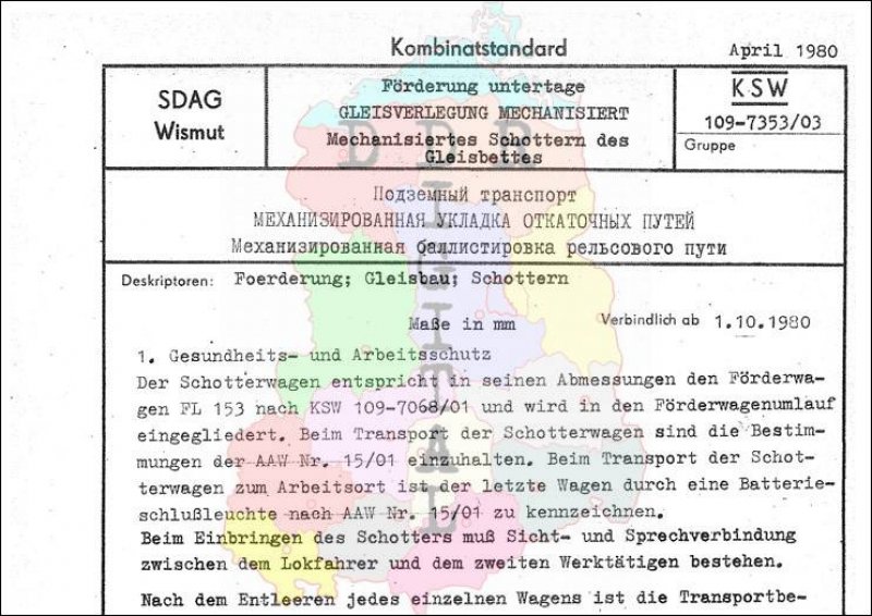 Standard: Kombinatstandard Ausgabe: April 1980 verbindlich ab: 01.10.1980 Verantwortlich: Generaldirektion der SDAG Wismut Karl-Marx-Stadt bestätigt am: 30.04.1980 Bestätigt von: Generaldirektion der SDAG Wismut Karl-Marx-Stadt Anzahl Seiten: 2 Notiz:
