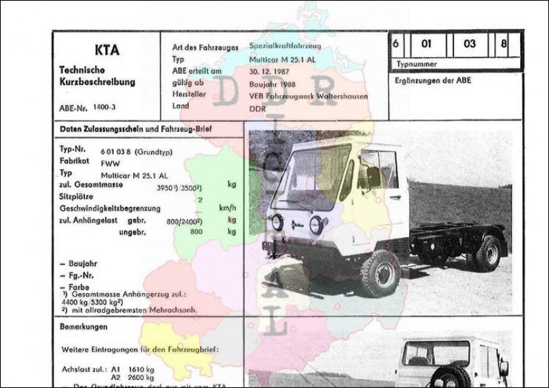 Art des Fahrzeuges: Spezialkraftfahrzeug Typ: Multicar M 25.1 AL ABE erteilt am: 30.12.1987 gültig ab: 1988 Hersteller: VEB Fahrzeugwerk Waltershausen Land: DDR Ergänzung zur ABE: Typnummer: 601038 Anzahl Seiten: 2