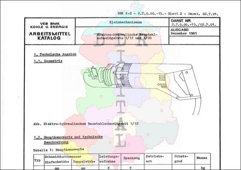 Kleinmechanismen: Elektro-hydraulisches Baustahlschneidgeräte 1/12 und 1/20 Ausgabe: Dezember 1981 Anzahl Seiten: 2 Notiz: