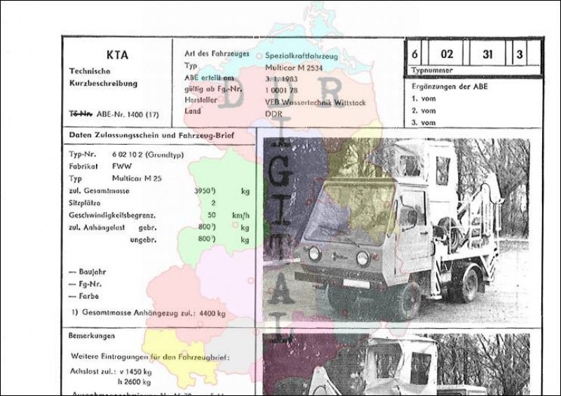 Art des Fahrzeuges: Spezialkraftfahrzeug Typ: Multicar M 2534 ABE erteilt am: 03.01.1983 gültig ab Fg.-Nr.: 1 000 1 78 Hersteller: VEB Fahrzeugwerk Waltershausen Land: DDR Ergänzung zur ABE: Typnummer: 602313 Anzahl Seiten: 2