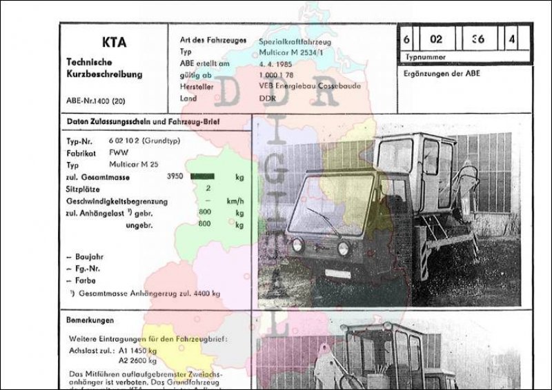 Art des Fahrzeuges: Spezialkraftfahrzeug Typ: Multicar M 2534/1 ABE erteilt am: 04.04.1985 gültig ab Fg.-Nr.: 1 000 1 78 Hersteller: VEB Fahrzeugwerk Waltershausen Land: DDR Ergänzung zur ABE: Typnummer: 602364 Anzahl Seiten: 2