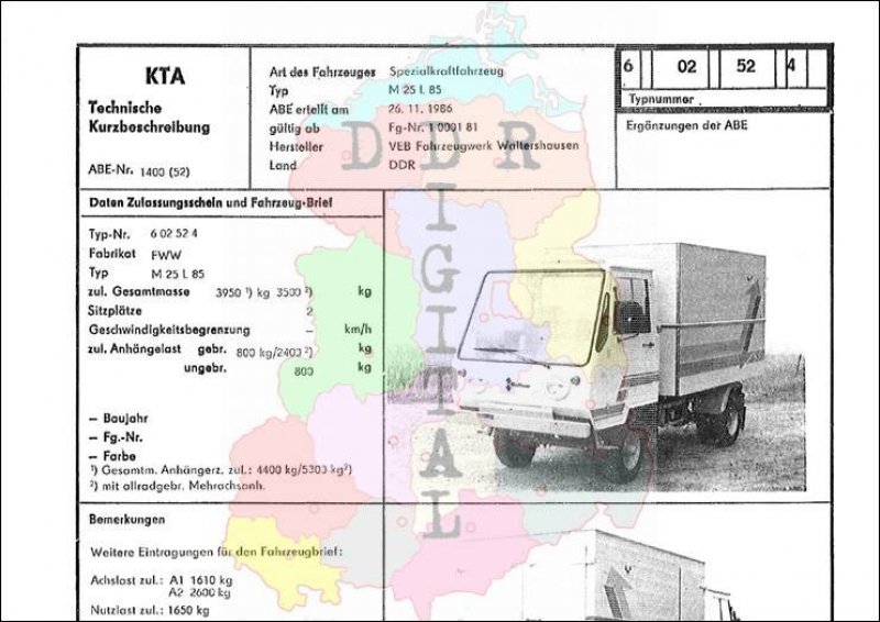 Art des Fahrzeuges: Spezialkraftfahrzeug Typ: M 25 L 85 ABE erteilt am: 26.11.1986 gültig ab Fg.-Nr.: 1 000 1 78 Hersteller: VEB Fahrzeugwerk Waltershausen Land: DDR Ergänzung zur ABE: Typnummer: 602524 Anzahl Seiten: 2
