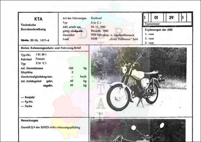 Art des Fahrzeuges: Kraftrad Typ: S 51 C 1 ABE erteilt am: 24.11.1982 gültig ab: 1982 Hersteller: VEB Fahrzeug- und Jagdwaffenwerk "Ernst Thälmann" Suhl Land: DDR Ergänzung zur ABE: Typnummer: 101391 Anzahl Seiten: 2