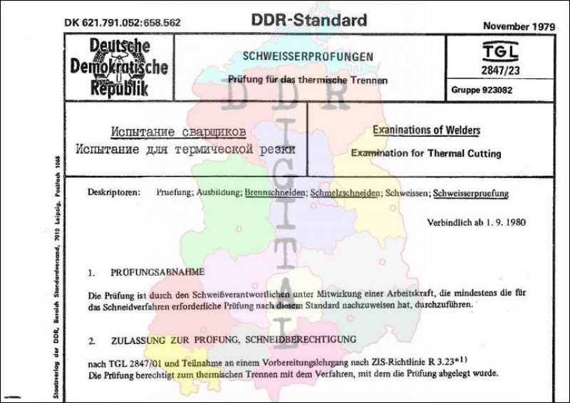 Standard: DDR-Standard Ausgabe: November 1979 verbindlich ab: 01.09.1980 Verantwortlich: Zentralinstitut für Schweisstechnik der Deutschen Demokratischen Republik bestätigt am: 29.11.1979 Bestätigt von: Amt für Standardisierung, Meßwesen und Warenprüfung Anzahl Seiten: 2
