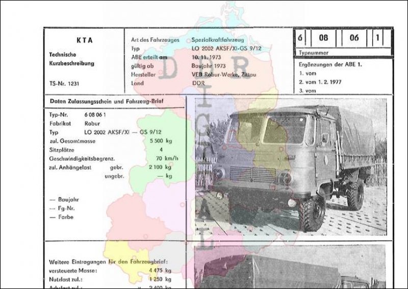 Art des Fahrzeuges: Spezialkraftfahrzeug Typ: LO 2002 AKSF/XI-GS 9/12 ABE erteilt am: 10.11.1973 gültig ab: 1973 Hersteller: VEB Robur-Werke Zittau Land: DDR Ergänzung zur ABE: 2. vom 01.02.1977 Typnummer: 608061 Anzahl Seiten: 2