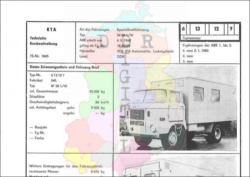 Art des Fahrzeuges: Spezialkraftfahrzeug Typ: W 50 L/W ABE erteilt am: 04.09.1969 gültig ab Fg.-Nr.: 78 00001 Hersteller: VEB IFA-Automobilwerke Ludwigsfelde Land: DDR Ergänzung zur ABE: 6. vom 02.01.1980 Typnummer: 613127 Anzahl Seiten: 2
