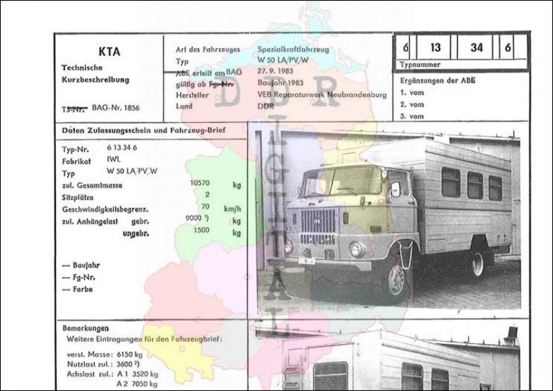 Art des Fahrzeuges: Spezialkraftfahrzeug Typ: W 50 LA/PV/W ABE erteilt am: 27.09.1983 gültig ab: 1983 Hersteller: VEB Reparaturwerk Neubrandenburg Land: DDR Ergänzung zur ABE: Typnummer: 613346 Anzahl Seiten: 2