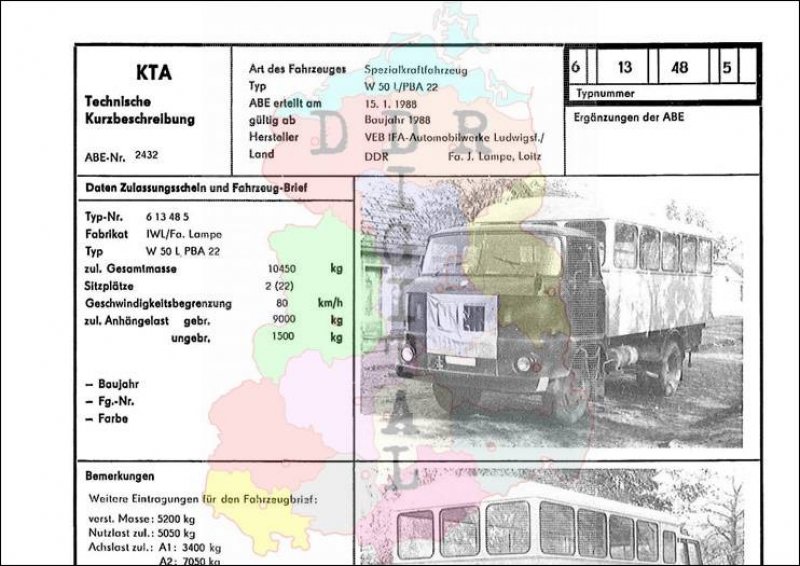 Art des Fahrzeuges: Spezialkraftfahrzeug Typ: W 50 L/PBA 22 ABE erteilt am: 15.01.1988 gültig ab: 1988 Hersteller: VEB IFA-Automobilwerke Ludwigsfelde / Fa. J. Lampe, Loitz Land: DDR Ergänzung zur ABE: Typnummer: 613485 Anzahl Seiten: 2
