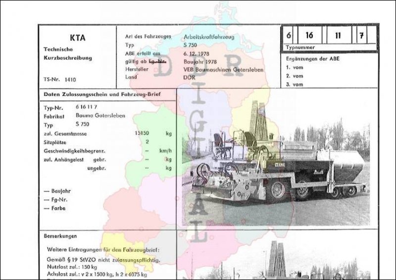 Art des Fahrzeuges: Arbeitskraftfahrzeug Typ: S 750 ABE erteilt am: 06.12.1978 gültig ab: 1978 Hersteller: VEB Baumaschinen Gatersleben Land: DDR Ergänzung zur ABE: Typnummer: 616117 Anzahl Seiten: 2