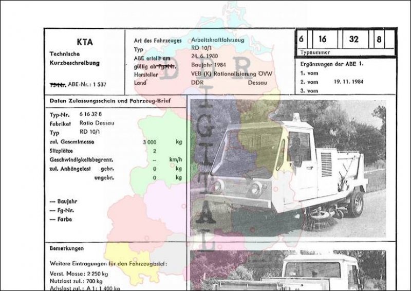 Art des Fahrzeuges: Arbeitskraftfahrzeug Typ: RD 10/1 ABE erteilt am: 24.06.1980 gültig ab: 1984 Hersteller: VEB (K) Rationalisierung der ÖVW Dessau Land: DDR Ergänzung zur ABE: 2. vom 19.11.1984 Typnummer: 616328 Anzahl Seiten: 2