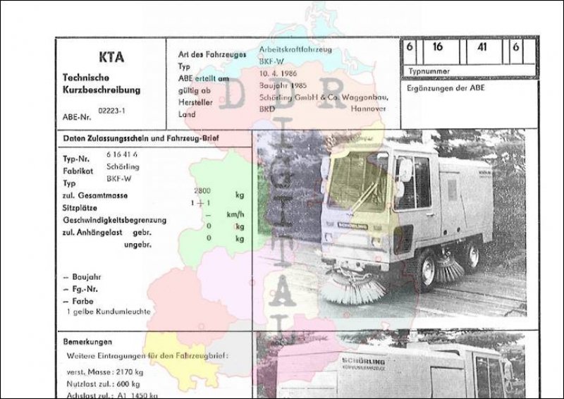 Art des Fahrzeuges: Arbeitskraftfahrzeug Typ: BKF-W ABE erteilt am: 10.04.1986 gültig ab: 1985 Hersteller: Schörling GmbH & Co. Waggonbau Hannover Land: BRD Ergänzung zur ABE: Typnummer: 616416 Anzahl Seiten: 2