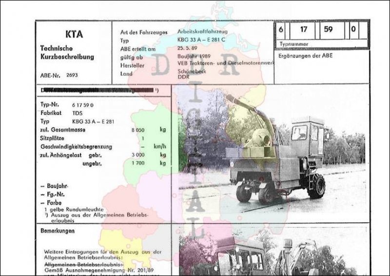 Art des Fahrzeuges: Arbeitskraftfahrzeug Typ: KBG 33 A-E281 C ABE erteilt am: 25.05.1989 gültig ab: 1989 Hersteller: VEB Traktoren- und Dieselmotorenwerk Schönebeck Land: DDR Ergänzung zur ABE: Typnummer: 617590 Anzahl Seiten: 3