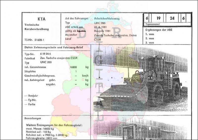 Art des Fahrzeuges: Arbeitskraftfahrzeug Typ: UNC 200 ABE erteilt am: 27.08.1981 gültig ab: 1981 Hersteller: Zavody Tazkeho Strojarstva, Detva Land: CSSR Ergänzung zur ABE: Typnummer: 619246 Anzahl Seiten: 2