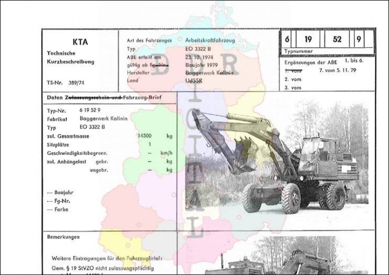 Art des Fahrzeuges: Arbeitskraftfahrzeug Typ: EO 3322 B ABE erteilt am: 23.10.1974 gültig ab: 1979 Hersteller: Baggerwerk Kalinin Land: UdSSR Ergänzung zur ABE: 7. vom 05.11.1979 Typnummer: 619529 Anzahl Seiten: 3