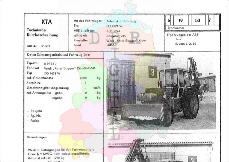 Art des Fahrzeuges: Arbeitskraftfahrzeug Typ: EO 2621 W ABE erteilt am: 03.09.1974 gültig ab: 1985 Hersteller: Werk Roter Bagger Kiew Land: UdSSR Ergänzung zur ABE: 8. vom 07.02.1986 Typnummer: 619537 Anzahl Seiten: 2
