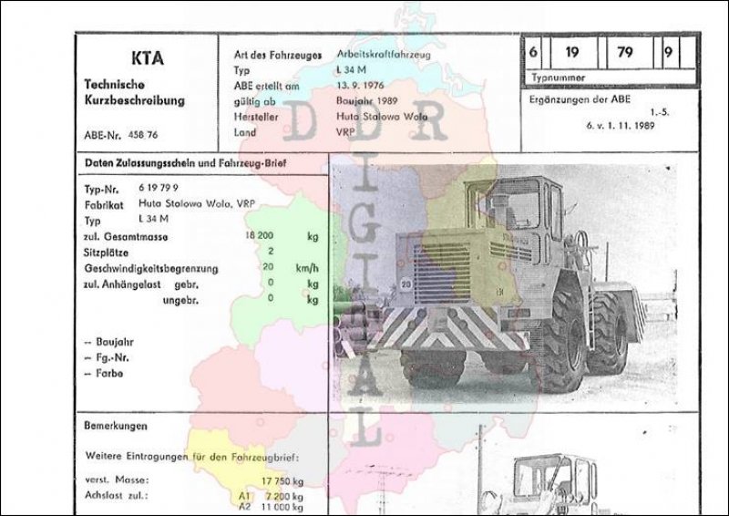 Art des Fahrzeuges: Arbeitskraftfahrzeug Typ: L 34 M ABE erteilt am: 13.09.1976 gültig ab: 1989 Hersteller: Huta Stalowa Wola Land: VR Polen Ergänzung zur ABE: 6. vom 01.11.1989 Typnummer: 619799 Anzahl Seiten: 2