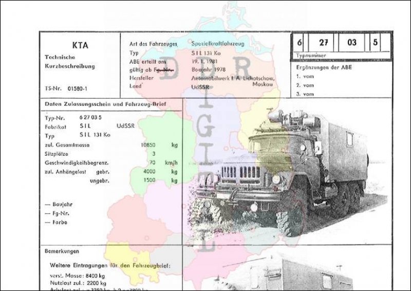 Art des Fahrzeuges: Spezialkraftfahrzeug Typ: SIL 131 Ko ABE erteilt am: 19.01.1981 gültig ab: 1978 Hersteller: Automobilwerk Lichatschow, Moskau Land: UdSSR Ergänzung zur ABE: Typnummer: 627035 Anzahl Seiten: 2
