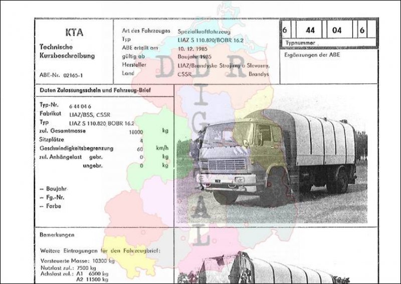 Art des Fahrzeuges: Spezialkraftfahrzeug Typ: LIAZ S 110.820/BOBR 16.2 ABE erteilt am: 10.12.1985 gültig ab: 1985 Hersteller: Skoda LIAZ Jablonec, Brandyske Strojirny a Stervarny Land: CSSR Ergänzung zur ABE: Typnummer: 644046 Anzahl Seiten: 2