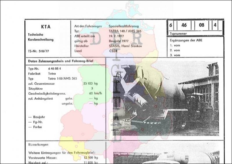 Art des Fahrzeuges: Spezialkraftfahrzeug Typ: Tatra 148/AMS 365 ABE erteilt am: 19.07.1977 gültig ab: 1977 Hersteller: Stasis, Horni Slavkov Land: CSSR Ergänzung zur ABE: Typnummer: 646084 Anzahl Seiten: 2