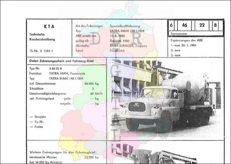Art des Fahrzeuges: Spezialkraftfahrzeug Typ: Tatra-MAM 148 L/BM ABE erteilt am: 14.08.1980 gültig ab: 1980 Hersteller: MAM Strager Land: Frankreich Ergänzung zur ABE: 1. vom 26.01.1981 Typnummer: 646228 Anzahl Seiten: 2