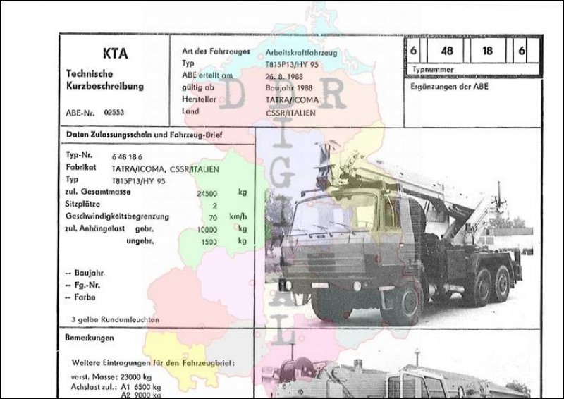 Art des Fahrzeuges: Spezialkraftfahrzeug Typ: T 815 P13/HY 65 ABE erteilt am: 26.08.1988 gültig ab: 1988 Hersteller: Tatra-Werke Koprivnice / ICOMA Land: CSSR / Italien Ergänzung zur ABE: Typnummer: 648186 Anzahl Seiten: 2