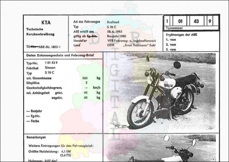 Art des Fahrzeuges: Kraftrad Typ: S 70 C ABE erteilt am: 28.06.1983 gültig ab: 1983 Hersteller: VEB Fahrzeug- und Jagdwaffenwerk "Ernst Thälmann" Suhl Land: DDR Ergänzung zur ABE: Typnummer: 101439 Anzahl Seiten: 2