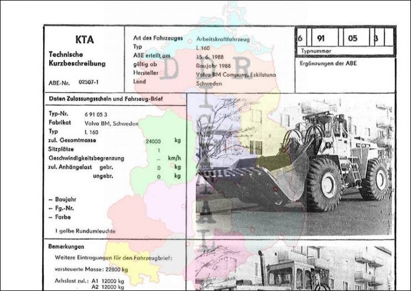 Art des Fahrzeuges: Arbeitskraftfahrzeug Typ: L 160 ABE erteilt am: 15.06.1988 gültig ab: 1988 Hersteller: Volvo BM Company Land: Schweden Ergänzung zur ABE: Typnummer: 691053 Anzahl Seiten: 3