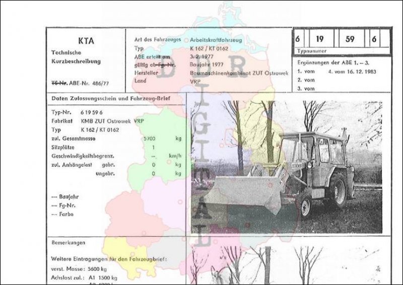 Art des Fahrzeuges: Arbeitskraftfahrzeug Typ: K 162 ABE erteilt am: 03.02.1977 gültig ab: 1977 Hersteller: Baumaschinenkombinat ZUT Ostrowek Land: VR Polen Ergänzung zur ABE: 4. vom 16.12.1983 Typnummer: 619596 Anzahl Seiten: 2