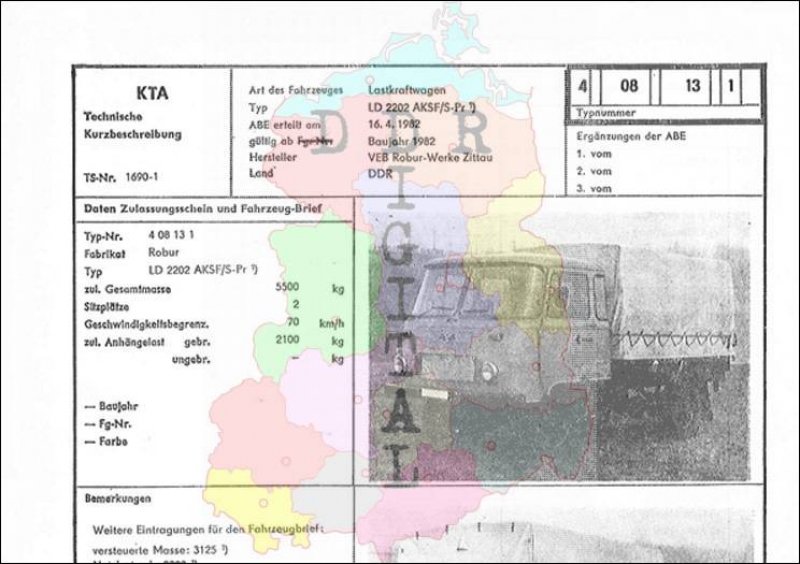 Art des Fahrzeuges: Lastkraftwagen Typ: LD 2202 AKSF/S-Pr ABE erteilt am: 16.04.1982 gültig ab: 1982 Hersteller: VEB Robur-Werke Zittau Land: DDR Ergänzung zur ABE: Typnummer: 408131 Anzahl Seiten: 2