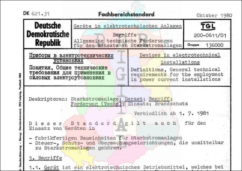 Standard: Fachbereichstandard Ausgabe: Oktober 1980 verbindlich ab: 01.07.1981 Verantwortlich: VEB Kombinat Elektroenergieanlagenbau Leipzig bestätigt am: 31.10.1980 Bestätigt von: VEB Kombinat Elektroenergieanlagenbau Leipzig Anzahl Seiten: 4