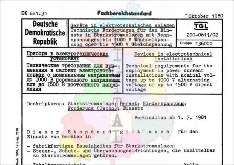 Standard: Fachbereichstandard Ausgabe: Oktober 1980 verbindlich ab: 01.07.1981 Verantwortlich: VEB Kombinat Elektroenergieanlagenbau Leipzig bestätigt am: 31.10.1980 Bestätigt von: VEB Kombinat Elektroenergieanlagenbau Leipzig Anzahl Seiten: 8