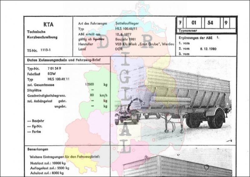 Art des Fahrzeuges: Sattelauflieger Typ: HLS 100.48/11 ABE erteilt am: 12.08.1971 gültig ab: 1981 Hersteller: VEB Kraftfahrzeugwerk Ernst Grube Werdau Land: DDR Ergänzung zur ABE: 2. vom 08.12.80 Typnummer 701549 Anzahl Seiten: 2