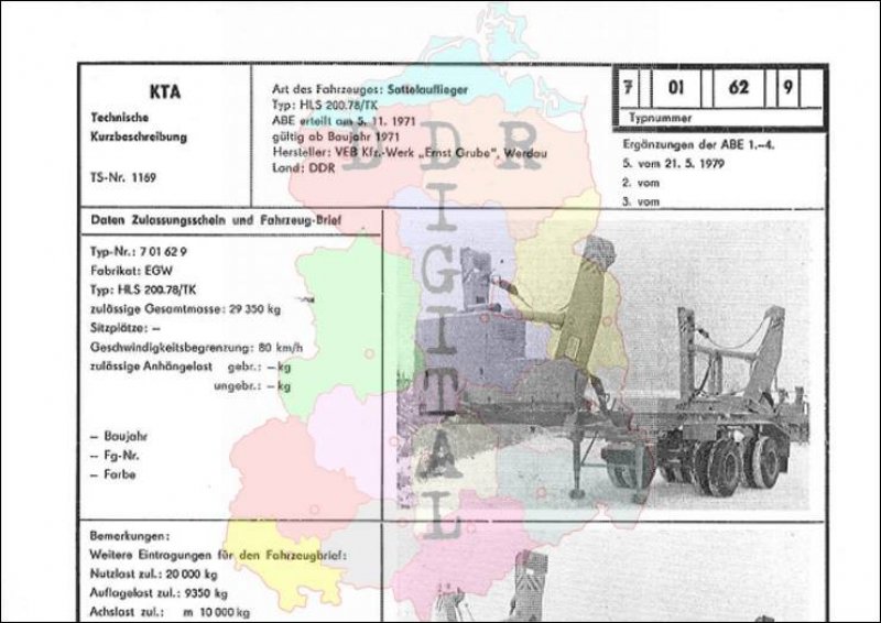 Art des Fahrzeuges: Sattelauflieger Typ: HLS 200.78/TK ABE erteilt am: 05.11.1971 gültig ab: 1971 Hersteller: VEB Kraftfahrzeugwerk Ernst Grube Werdau Land: DDR Ergänzung zur ABE: 5. vom 21.05.79 Typnummer 701629 Anzahl Seiten: 2