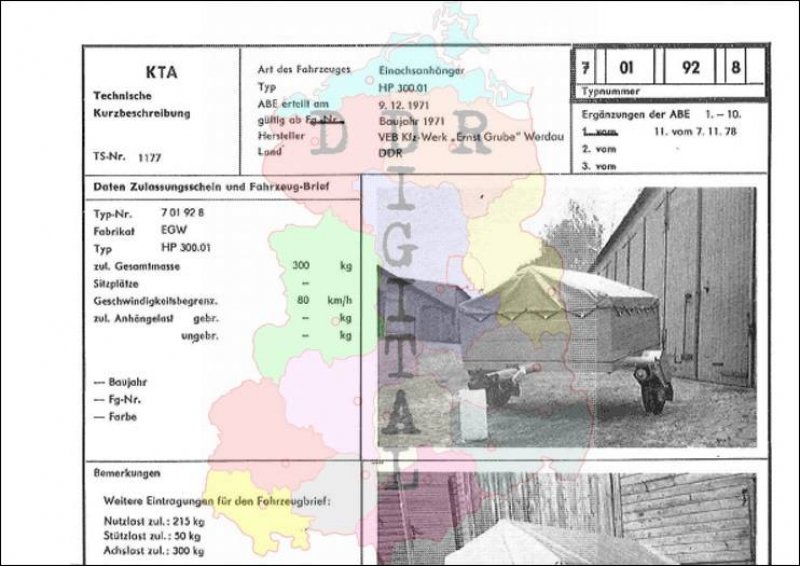 Art des Fahrzeuges: Einachsanhänger Typ: HP 300.01 ABE erteilt am: 09.12.1971 gültig ab: 1971 Hersteller: VEB Kraftfahrzeugwerk Ernst Grube Werdau Land: DDR Ergänzung zur ABE: 11. vom 07.11.78 Typnummer 701928 Anzahl Seiten: 2