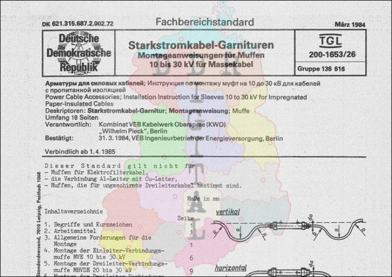 Standard: Fachbereichstandard Ausgabe: März 1984 verbindlich ab: 01.04.1985 Verantwortlich: Kombinat VEB Kabelwerk Oberspree Wilhelm Pieck Berlin bestätigt am: 31.03.1984 Bestätigt von: VEB Ingenieurbetrieb der Energieversorgung Berlin Anzahl Seiten: 20