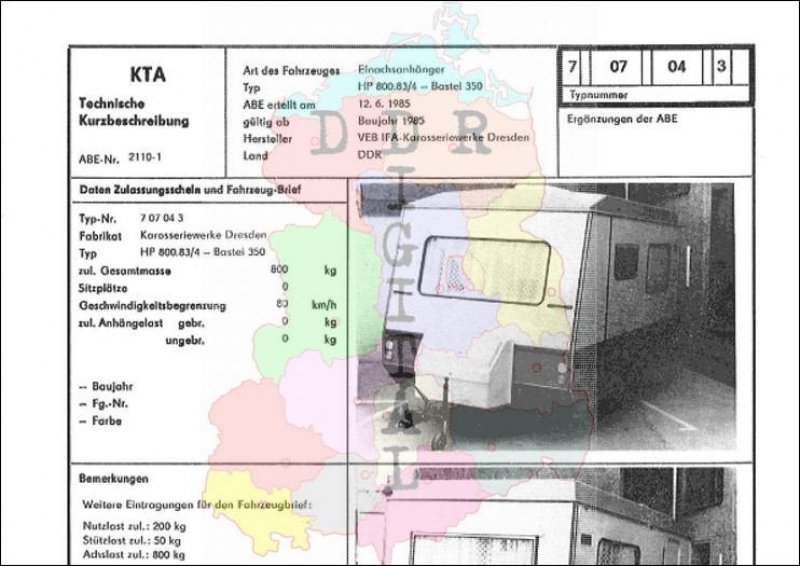 Art des Fahrzeuges: Einachsanhänger Typ: HP 800.83/4 - Bastei 350 ABE erteilt am: 12.06.1985 gültig ab: 1985 Hersteller: VEB IFA-Karosseriewerk Dresden Land: DDR Ergänzung zur ABE: Typnummer 707043 Anzahl Seiten: 2
