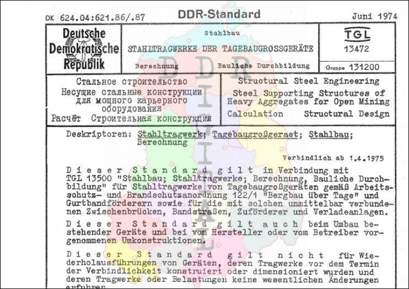Standard: DDR-Standard Ausgabe: Juni 1974 verbindlich ab: 01.04.1975 Verantwortlich: VVB Tagebauausrüstungen, Krane und Förderanlagen bestätigt am: 26.06.1974 Bestätigt von: Amt für Standardisierung, Meßwesen und Warenprüfung Anzahl Seiten: 32