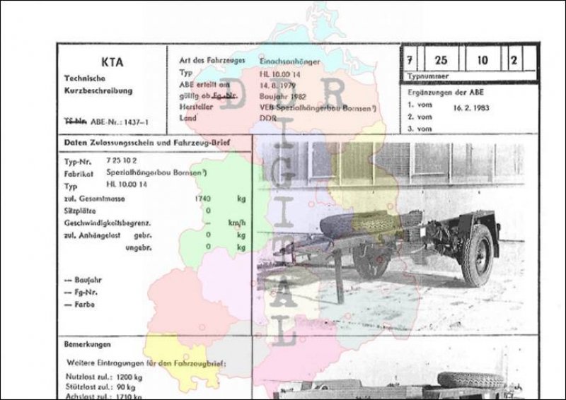 Art des Fahrzeuges: Einachsanhänger Typ: HL 10.00/14 ABE erteilt am: 14.08.1979 gültig ab: 1982 Hersteller: VEB Spezialhängerbau Bornsen Land: DDR Ergänzung zur ABE: 1. vom 16.02.1983 Typnummer 725102 Anzahl Seiten: 2