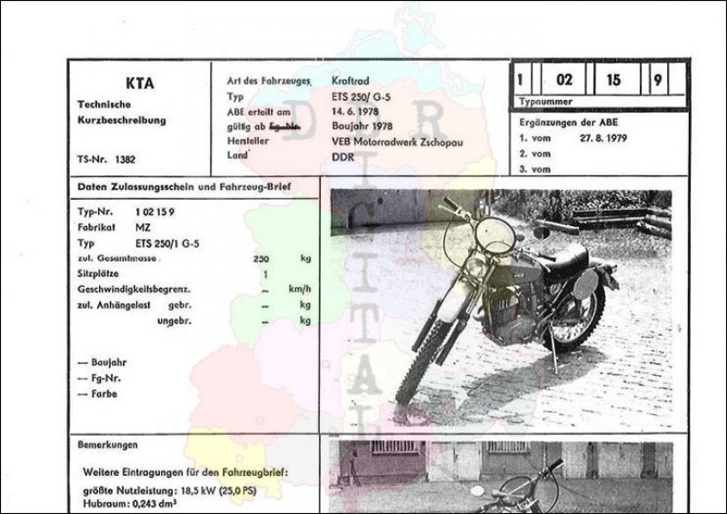 Art des Fahrzeuges: Kraftrad Typ: ETS 250/ G-5 ABE erteilt am: 14.06.1978 gültig ab: 1978 Hersteller: VEB Motorradwerk Zschopau Land: DDR Ergänzung zur ABE: 1. vom 27.08.1979 Typnummer: 102159 Anzahl Seiten: 2