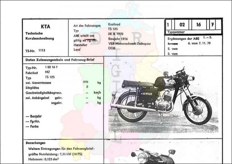 Art des Fahrzeuges: Kraftrad Typ: TS 125 ABE erteilt am: 28.08.1970 gültig ab: 1976 Hersteller: VEB Motorradwerk Zschopau Land: DDR Ergänzung zur ABE: 6. vom 07.11.1979 Typnummer: 102167 Anzahl Seiten: 2