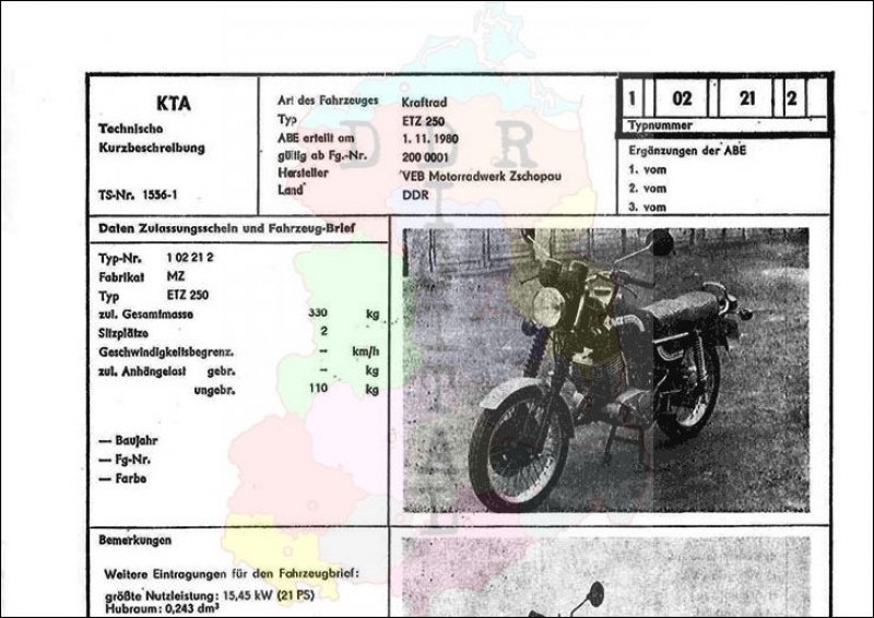Art des Fahrzeuges: Kraftrad Typ: ETZ 250 ABE erteilt am: 01.11.1980 gültig ab Fg-Nr.: 200 0001 Hersteller: VEB Motorradwerk Zschopau Land: DDR Ergänzung zur ABE: Typnummer: 102212 Anzahl Seiten: 2
