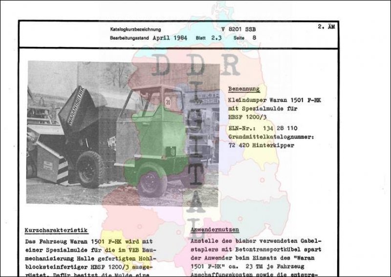 Kleinmechanismen: Kleindumper Waran 1501 F-HK mit Spezialmulde für HBSF 1200/3 Ausgabe: Apr. 1984 Anzahl Seiten: 1 Notiz: