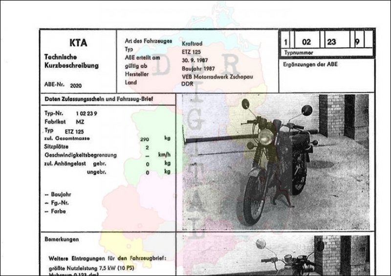 Art des Fahrzeuges: Kraftrad Typ: ETZ 125 ABE erteilt am: 30.09.1987 gültig ab: 1987 Hersteller: VEB Motorradwerk Zschopau Land: DDR Ergänzung zur ABE: Typnummer: 102239 Anzahl Seiten: 2