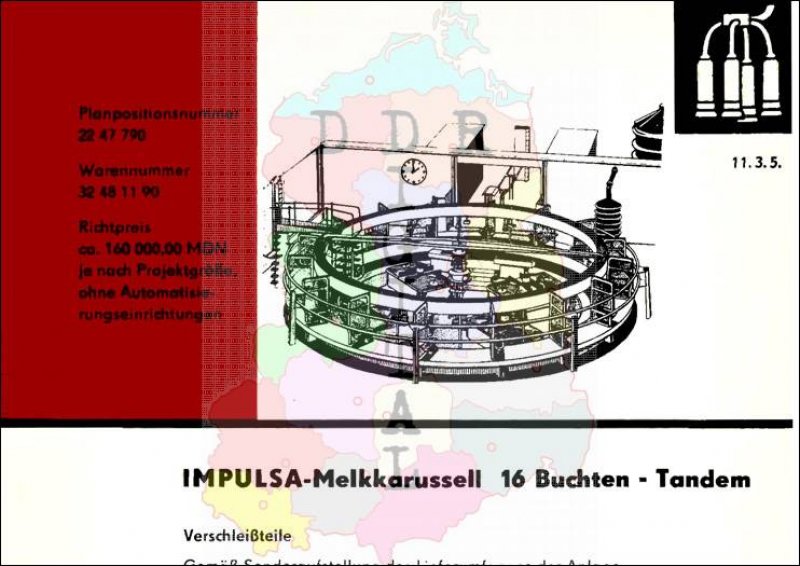 Herausgeber: VVB Landmaschinen- und Traktornbau Leipzig Entwicklungs- und Herstellerbetrieb: VEB ELFA Elsterwerda Anzahl Seiten 2 In dem Landmaschinen-Katalog sind Maschinen und Geräte enthalten, welche zur weiteren Mechanisierung in der sozialistischen Landwirtschaft bestimmt waren. Dieser Katalog sollte die Genossenschaften bei der Planung neuer Technik für ihren Betrieb unterstützen.