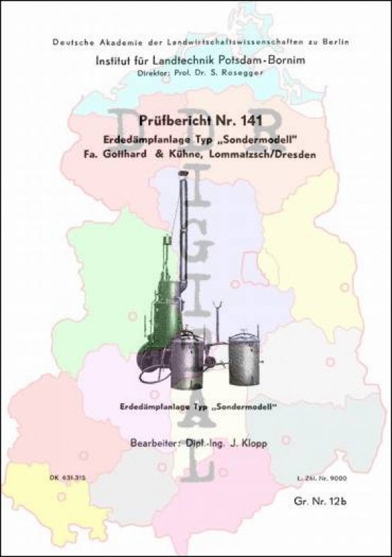 Prüfbericht Nr.: 141 Prüfstelle:: Institut für Landtechnik Potsdam-Bornim Hersteller:: Gotthardt & Kühne BSB Prüfgegenstand Erdedämpfanlage Typ "Sondermodell" Prüfdatum: 24. April 1958 Anzahl Seiten: 12